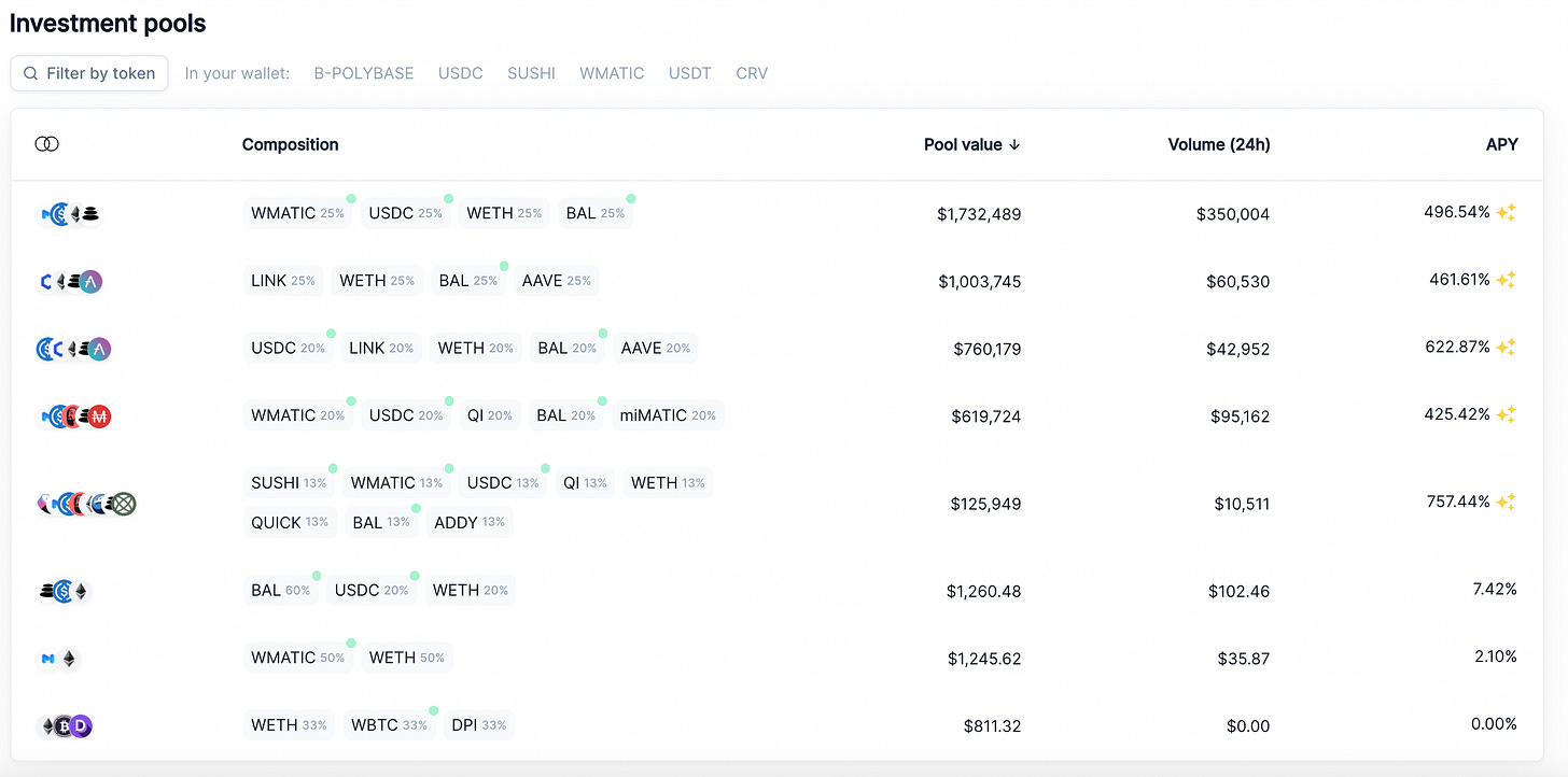 Be advised to avoid HUGE slippage by having an equal weight of each asset in the pool before you deposit. E.g. If I were to enter the top pool with just WMATIC, I would need to purchase 33% USDC, WETH, and BAL to create the equal weights required. The limited liquidity would mean I’d end up with 15% less WMATIC than if I were to use Balancer’s exchange and buy each asset individually with WMATIC.