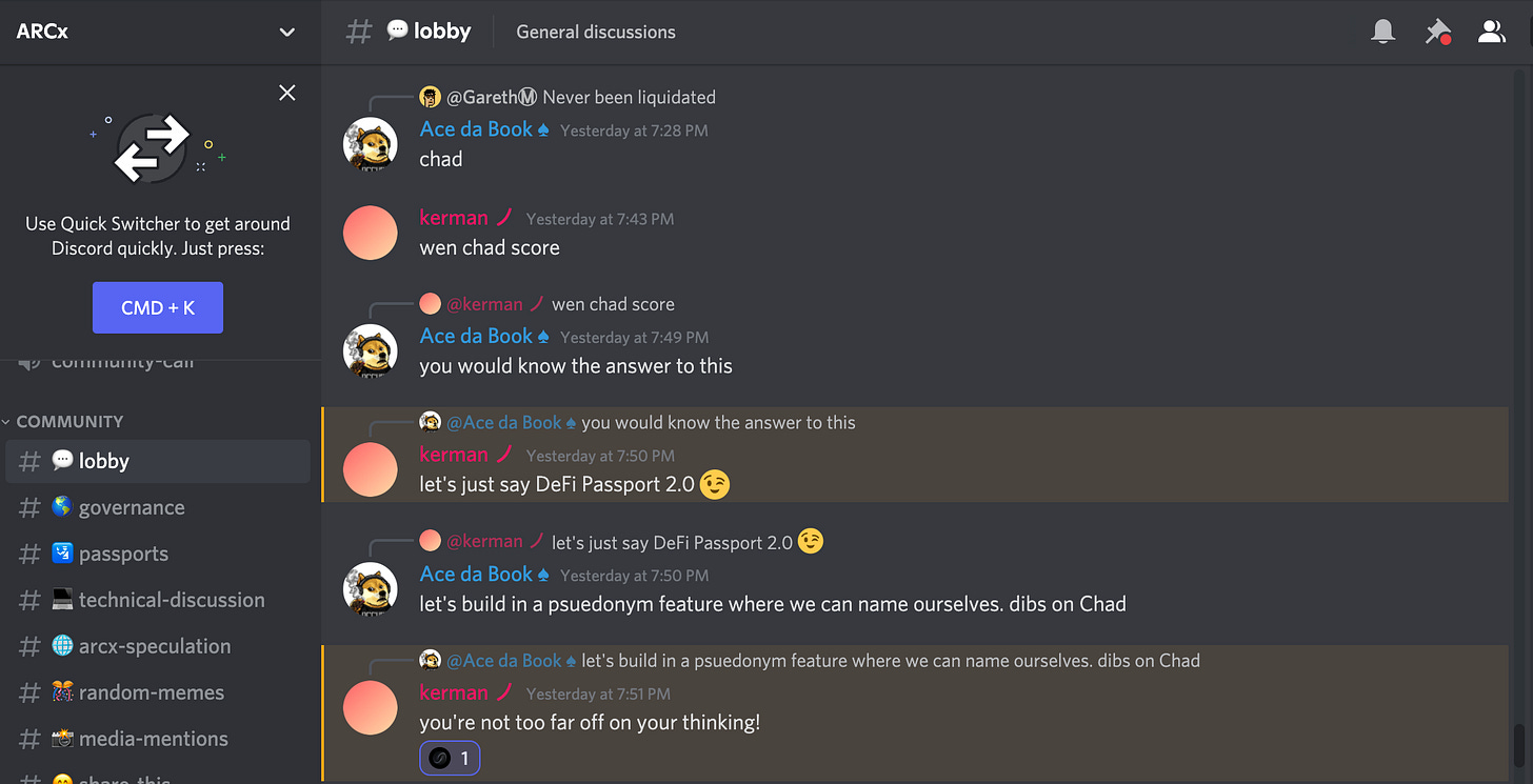 The blockchain allows for psuedoanonymity and protects users from predatory marketing and banking practices. ARCx will be integral in preserving users’ privacy while still communicating thorough information to 3rd parties that require review. An Easter egg already in the plans is DeFi Passport users will be able to call ourselves whatever we want. Crypto is famous for green frogs, anime characters, cats, and cartoonishly muscular Chads.