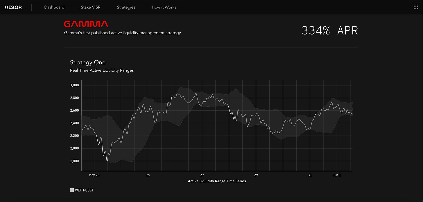 Impressive APY for a WETH-USDT using the best “Gamma” strategy - an actively managed LP position on Uni V3. Visor is funding the creation of these Gamma strategies due to the complexity and R&D required for optimize LP’ing with Uni V3.
